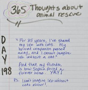 Emma says August 29, 2013 at 12:15 pm Good for Sophie. One of our adopted cats is named Sophie too. My says she will always need at least one dog and one cat. Reply